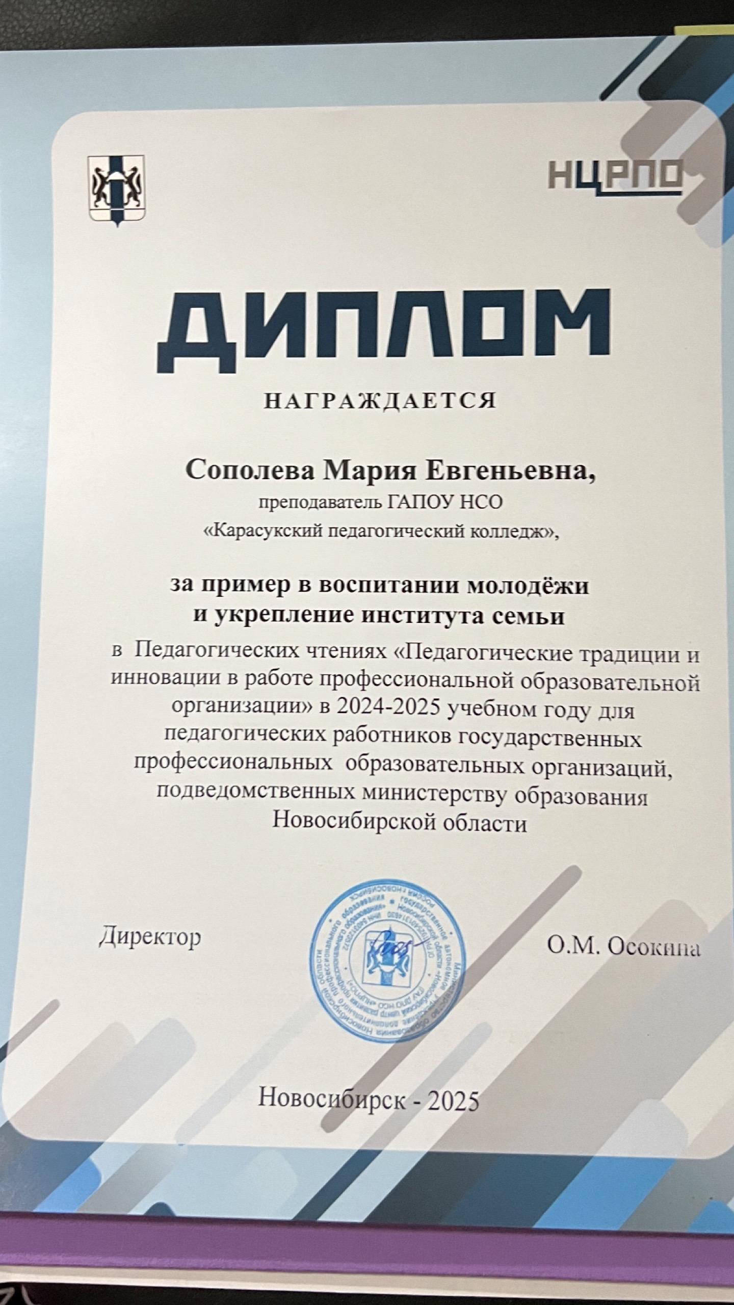 6 марта в ГАУ ДПО Новосибирской области «Новосибирский центр развития профессионального образования» проводились педагогические чтения «Педагогические традиции и инновации в работе профессиональной образовательной организации. Я выступила с докладом по теме «Развитие ценностных представлений будущих педагогов в области семейного воспитания».