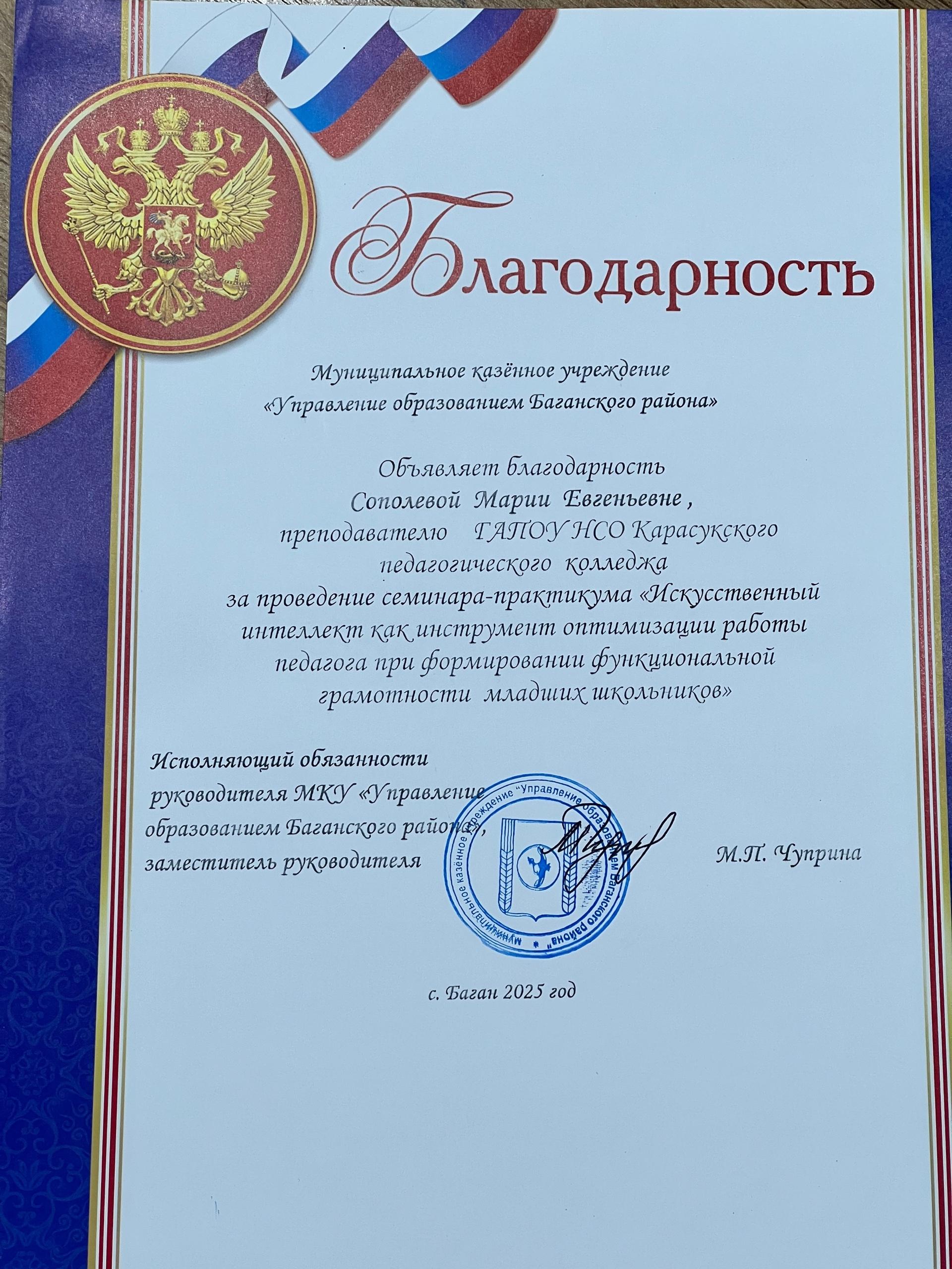 2 декабря 2023 года преподавателям ГАПОУ НСО "Карасукский педагогический колледж" за проектную работу "Симулятор-тренажёр "Конструктор конспекта учебного занятия для начальной школы" была вручена малая золотая медаль конкурса "Золотая медаль - 2023" в номинации "Образование цифрового века"